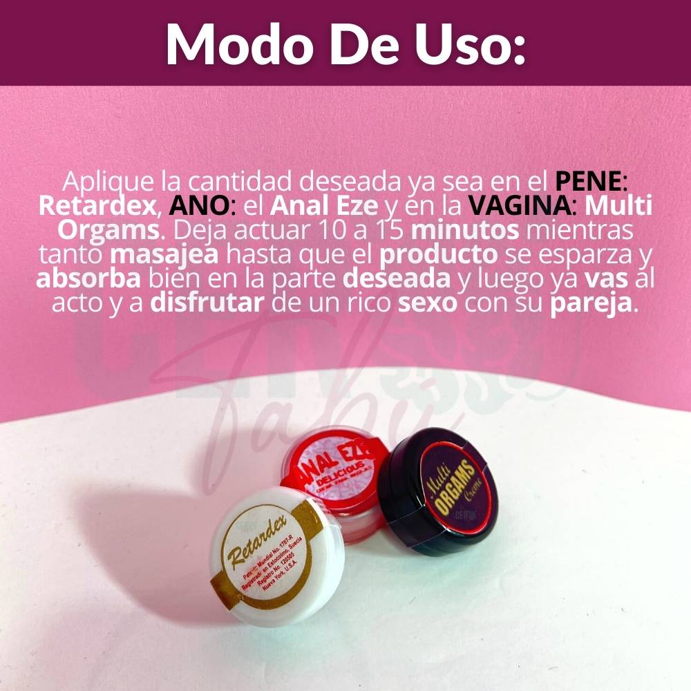 Bienvenidos a una nueva era de placer y satisfacción. Descubre el potencial ilimitado de tu intimidad con nuestros productos diseñados para empoderar tus experiencias sexuales. Presentamos nuestro lubricante anal con lidocaína en crema. Nuestra fórmula única está diseñada para ampliar suavemente la cavidad anal, eliminando cualquier sensación de malestar al introducir el pene o juguete sexual. Pero eso no es todo. Eleva tu conexión con tu pareja a niveles inexplorados con nuestro lubricante multiorgasmos. Al aplicar este lubricante directamente en la zona genital, desencadenas un aumento en el flujo sanguíneo, potenciando la sensibilidad y desencadenando oleadas de placer mutuo. Y para aquellos que buscan prolongar y maximizar el placer, presentamos nuestro retardante masculino de vanguardia. La solución definitiva para abordar la eyaculación precoz de manera efectiva y al instante. CARACTERISTICAS: