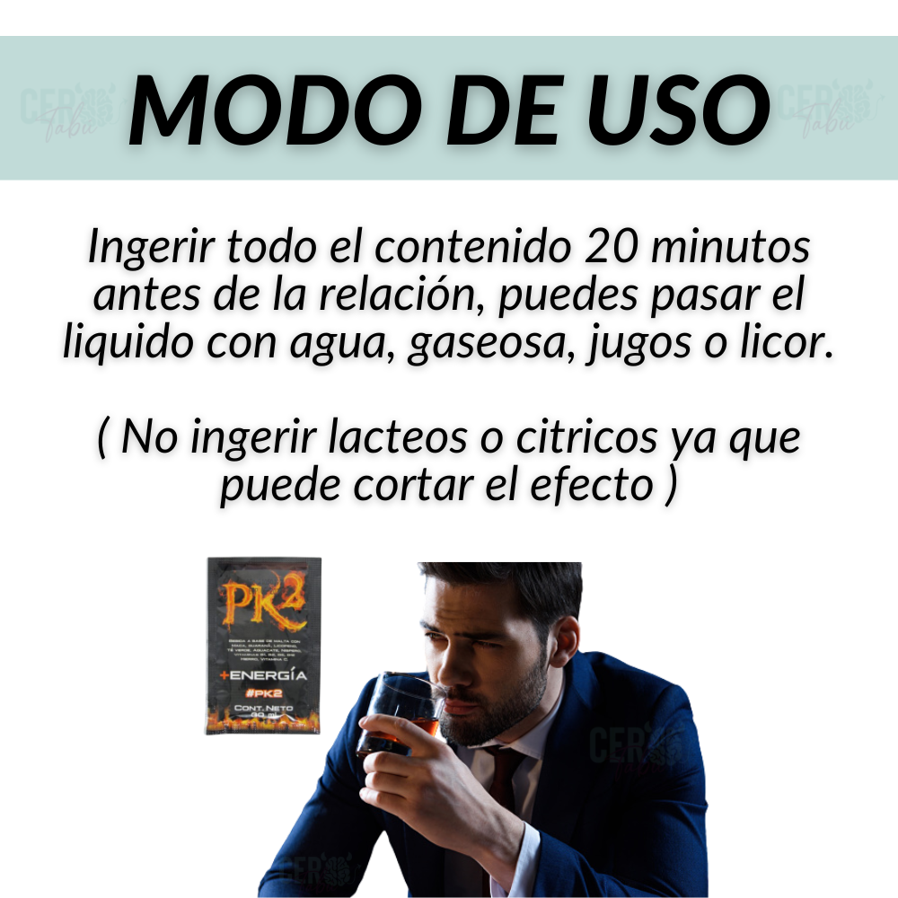 PK2, el potenciador que transformará tus momentos íntimos. Si buscas mejorar tu libido, ayudar a evitar la eyaculación precoz, aumentar tu autoestima, PK2 es la solución, hecho a base de ingredientes naturales. Solo debes preparar tu cuerpo consumiendo un sobre 20 minutos antes de tus encuentros íntimos. Puedes pasarlo con agua gaseosa, jugos o licor, recuerda evitar los lácteos y cítricos al ingerir PK2, ya que pueden cortar el efecto. Queremos que disfrutes al máximo de los beneficios de este potenciador, por eso te recomendamos seguir estas indicaciones para obtener resultados óptimos.