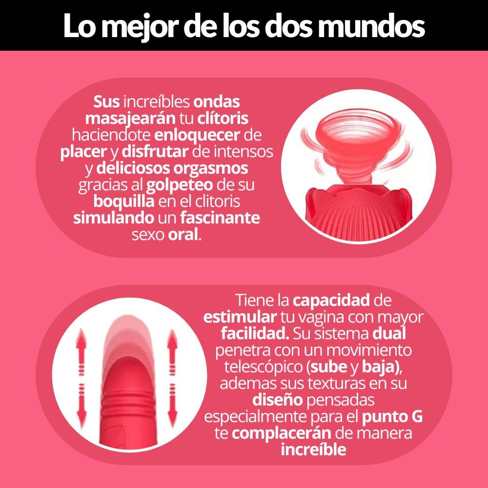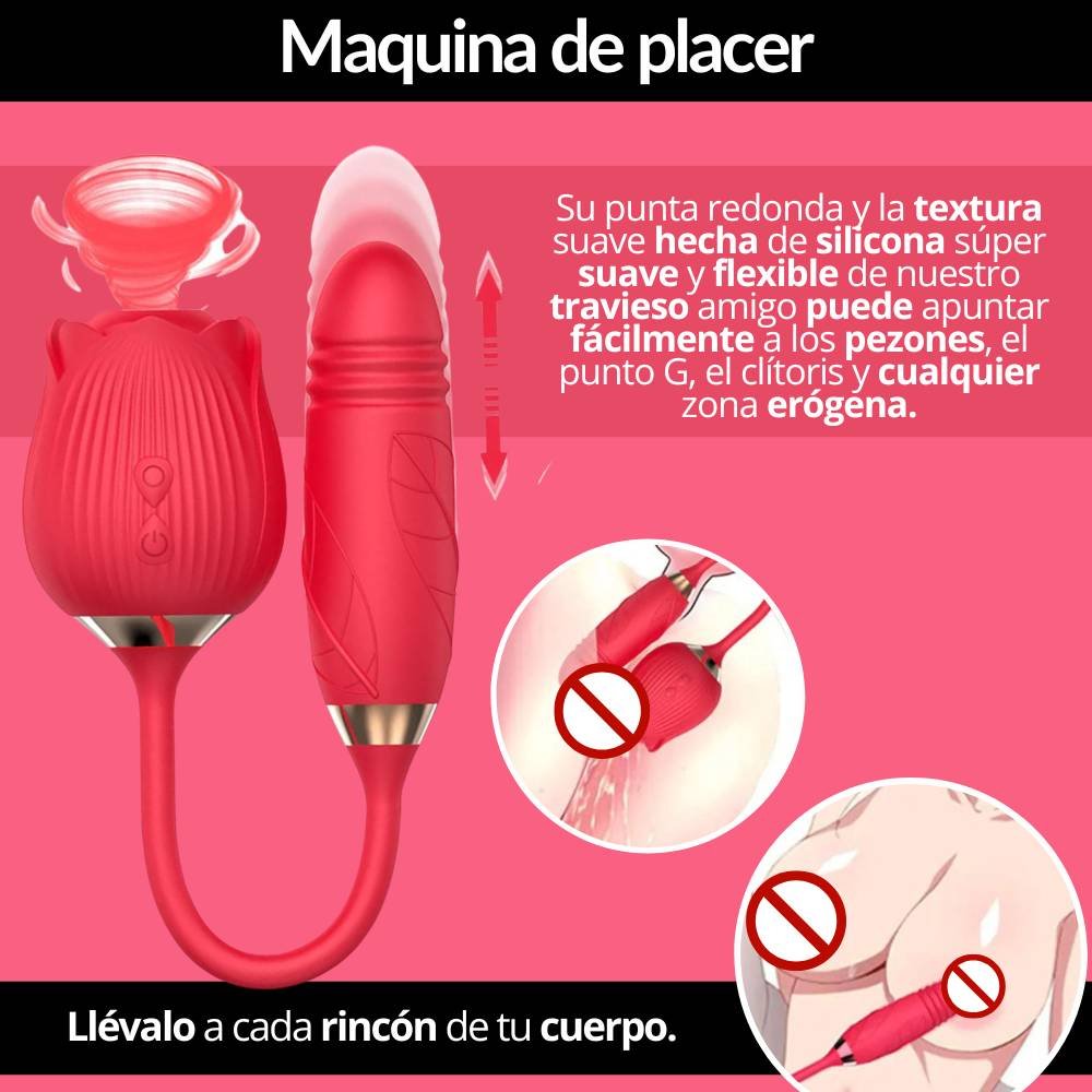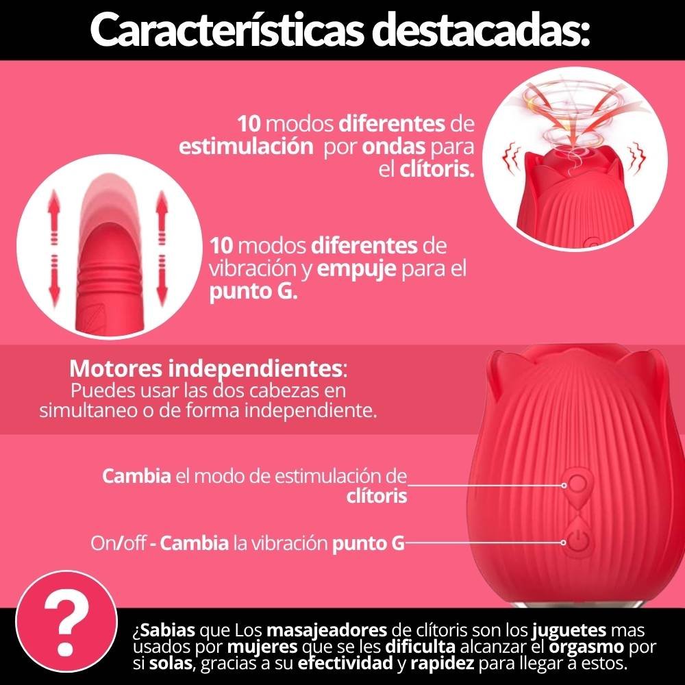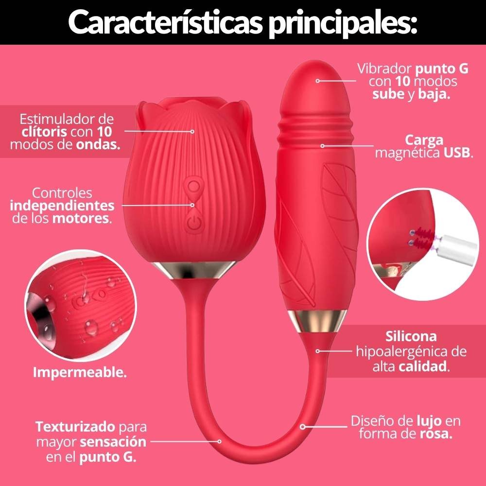 Destaca por su forma de rosa y sus modos de vibración, los cuales estimulan el punto G y el clítoris. Cuenta con una bala con texturas para estimular el punto G, la cual tiene 10 modos de vibración y modo telescópico (movimiento sube y baja) con diferentes velocidades. Por otro lado, su estimulador de clítoris en forma de rosa tiene una lengua que simula la experiencia del sexo oral, brindando una sensación intensa y placentera, la cual cuenta también con 10 modos de vibración. En total, son 10 funciones que puedes combinar de la manera que más te guste. Además, cuenta con dos controles independientes de los motores. Cualquiera de los dos te hará llegar al orgasmo en tan solo minutos. Su material es suave y delicado, fabricado en silicona médica hipoalergénica de alta calidad, recargable con carga magnética para mayor comodidad.